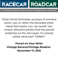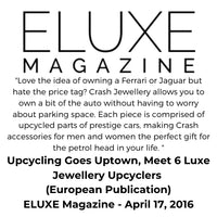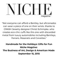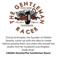 CRASH Jewelry, based in Los Angeles, creates sustainable cuffs, bangles, earrings, necklaces, and accessories handcrafted from the metal of luxury automobiles. Founded by Christi Schimpke in 2013, CRASH transforms discarded car metal—often from brands like Ferrari, Lamborghini, and Bentley—into one-of-a-kind wearable art. Each piece preserves the car’s original paint and tells a story of craftsmanship, sustainability, and history. Our designs appeal to eco-conscious shoppers, car enthusiasts, and fashion lovers alike, and a portion of every sale supports charitable causes. CRASH Jewelry has been featured in major publications, on television, and on runways, celebrating the art of handmade design with a meaningful purpose.